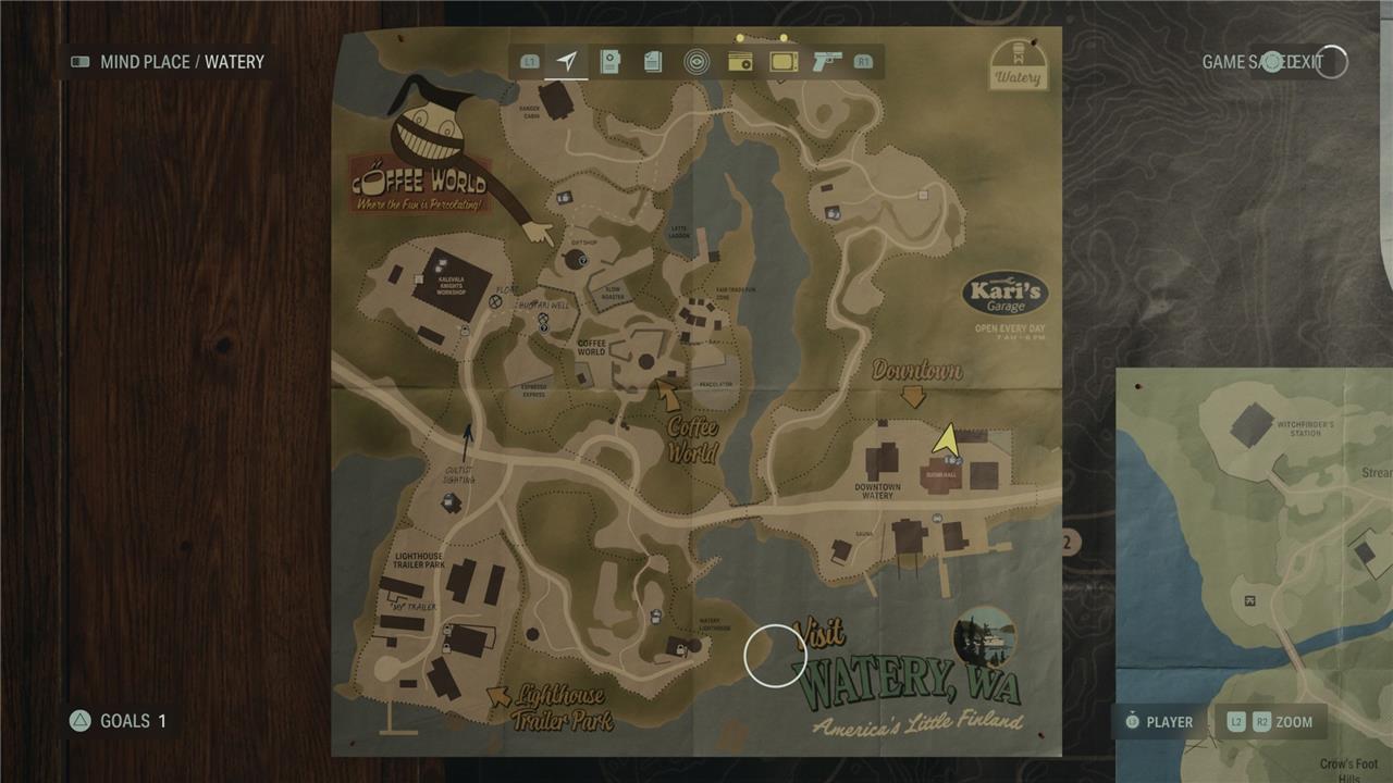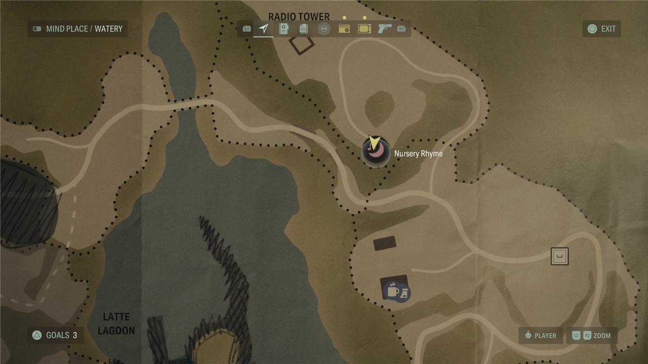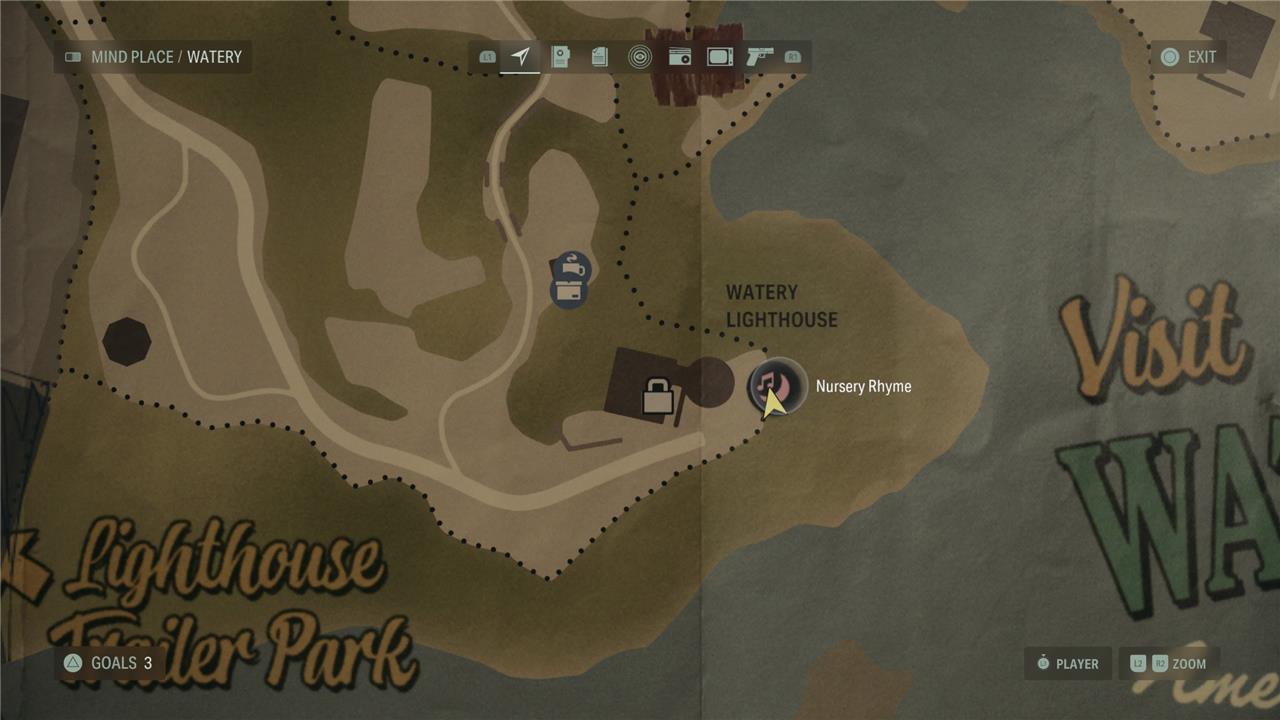 The Watery Nursery Rhymes in Alan Wake 2 are a set of eight challenging puzzles scattered throughout the Watery area, accessible mostly later in the story. Each rhyme involves finding specific dolls and placing them correctly on chalk drawings that correspond to the clues in the rhyme. Notable locations include north of Downtown Watery, the Lighthouse, the Trailer Park, and the Downtown trailer. Successfully solving these rhymes rewards players with useful charms such as the Coffee Mug Charm, Lighthouse Charm, Coffee World Token Charm, and Deer Charm, which enhance Saga’s abilities. Some dolls needed for these puzzles are found nearby, like the moose doll north of Downtown or the wise elder and trickster dolls near the Lighthouse. These nursery rhymes add a layer of eerie atmosphere and rewarding exploration to the game’s survival horror experience.