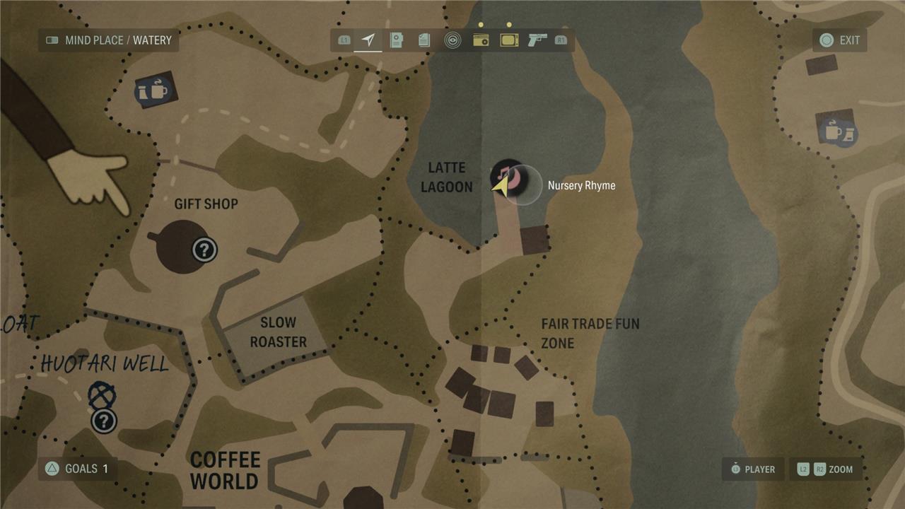 Once the flooding has gone down in Watery, head back into Coffee World to the Latte Lagoon dock on the map – just north of the Fair Trade Fun Zone. You’ll need the Deer, Moose, and Trickster Dolls, which you can get from the Nursery Rhyme north of downtown and the Lighthouse rhyme.