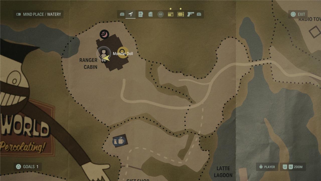 Place the Wise Elder Doll on the waves and place the Bear Doll on the candy. This will solve the riddle and spawn some Taken in the trailer park. Head back to the fish station to grab the Coffee World charm, which increases the quantity and quality of any resources you find.