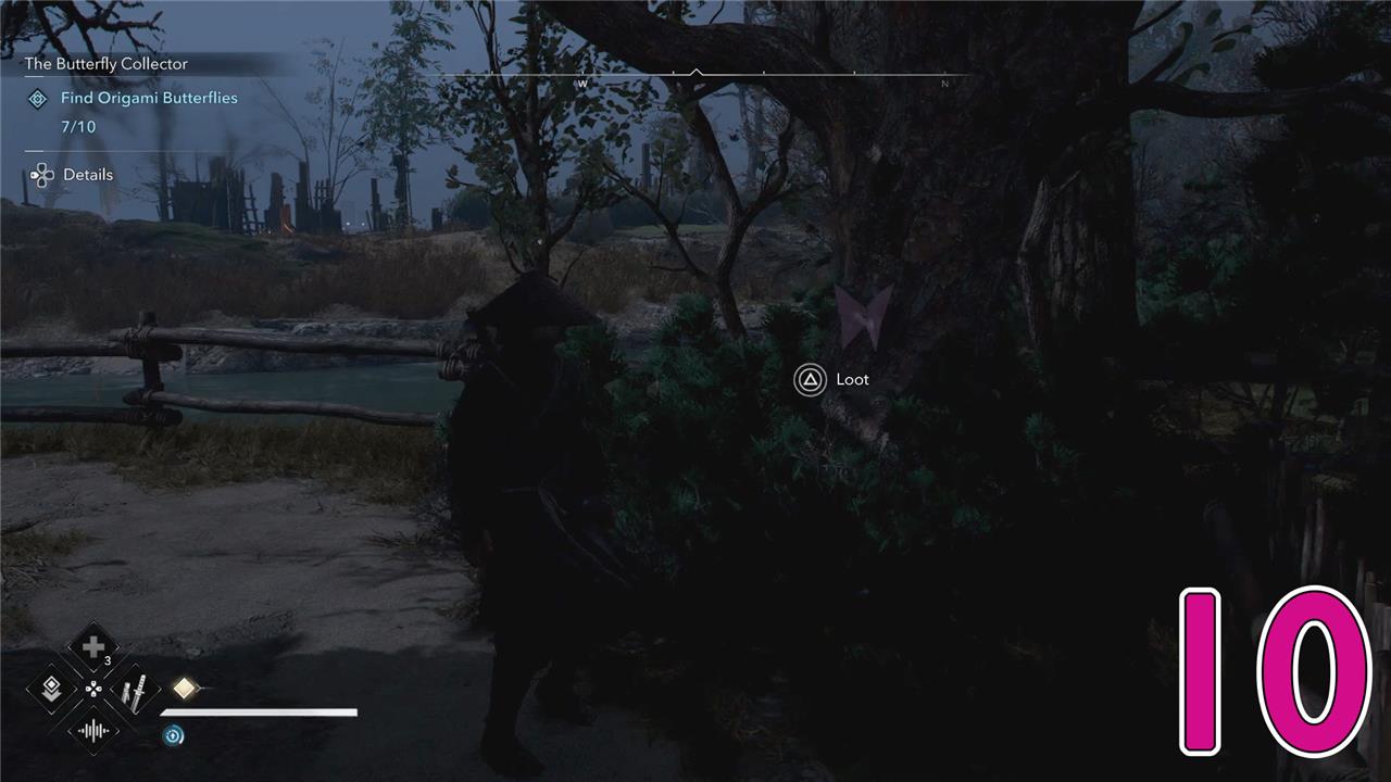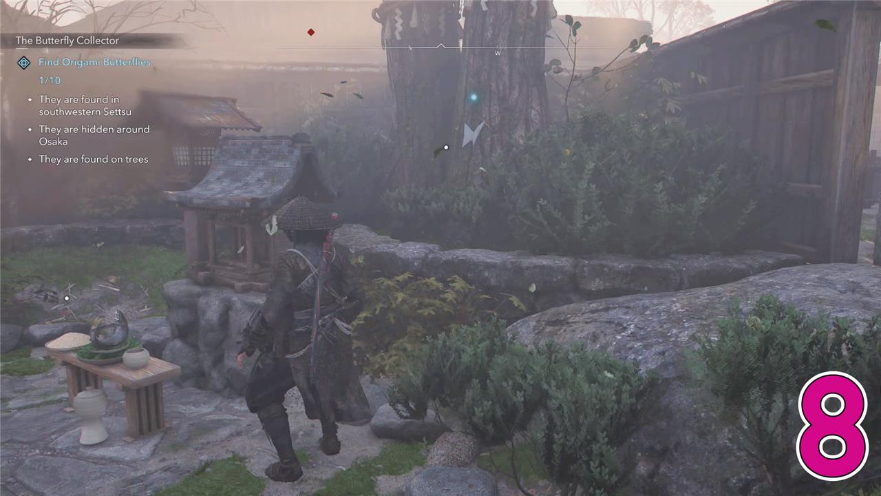 You’ll find the 10 origami butterflies around Osaka. They’re all contained to a pretty limited area – only a few of them are even off the island where you’ll find the Temple of Osaka and the Osaka kakurega. They’re all found on trees (not on buildings or walls) and none of them are in any enemy-controlled neighborhoods.