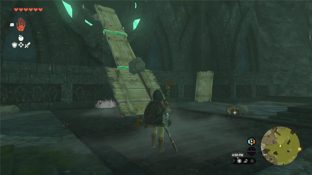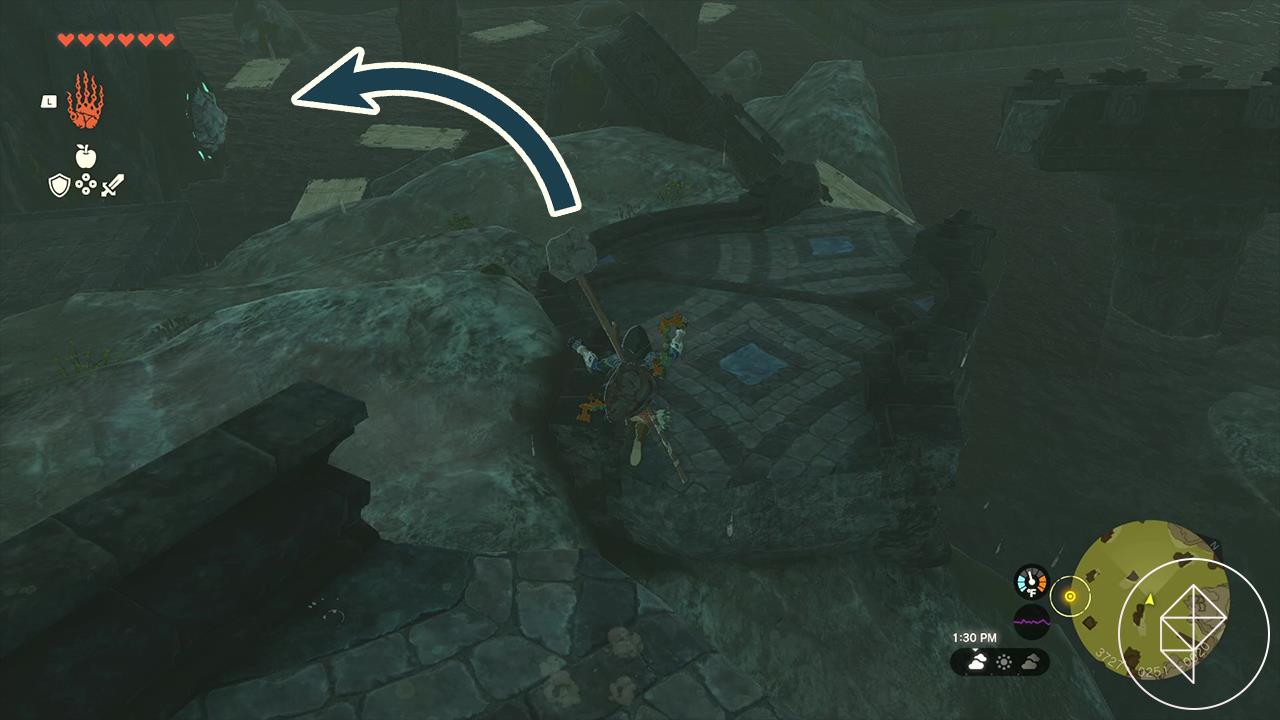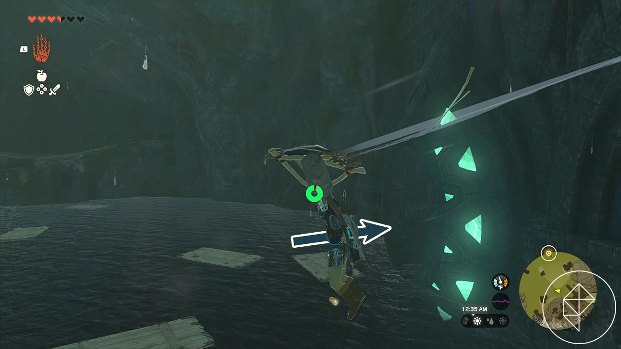 Head up the broken bridge, using Ultrahand on planks to climb up broken parts when necessary. At the end of the bridge, enter the cave on the right.