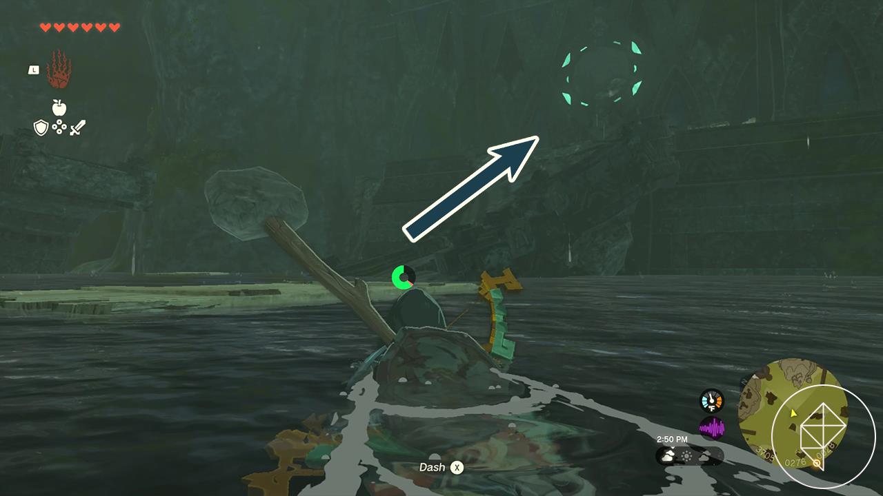 Head up the walkway, making sure to use Ultrahand on the wooden chest in the water on your left for a Zora shield.