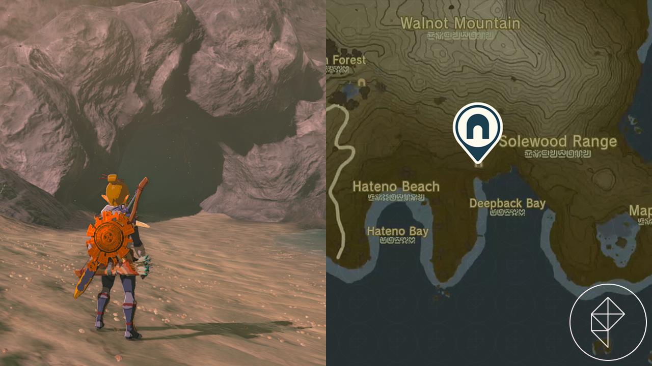 Glide east from Hateno Ancient Tech Lab to spot the cave mouth on Deepback Bay’s western shore; expect Horriblins inside before reaching the waterlogged shrine area.โ€‹