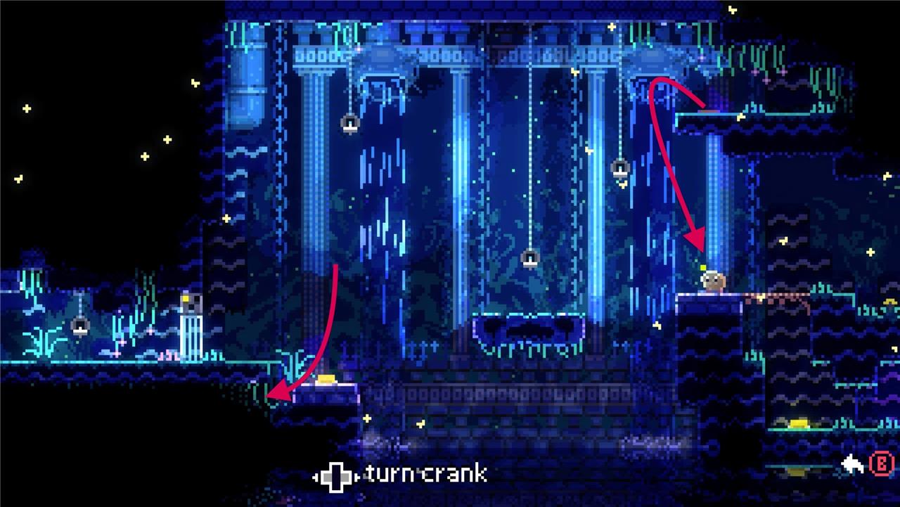 When you reach Animal Well’s first save point, you’ll see the squirrel to the left (it’ll run to the right), but you’ll hit a dead end if you go that way. Heading two screens to the right, you’ll run into your first enemy, a blue ghost, guarding a crank.