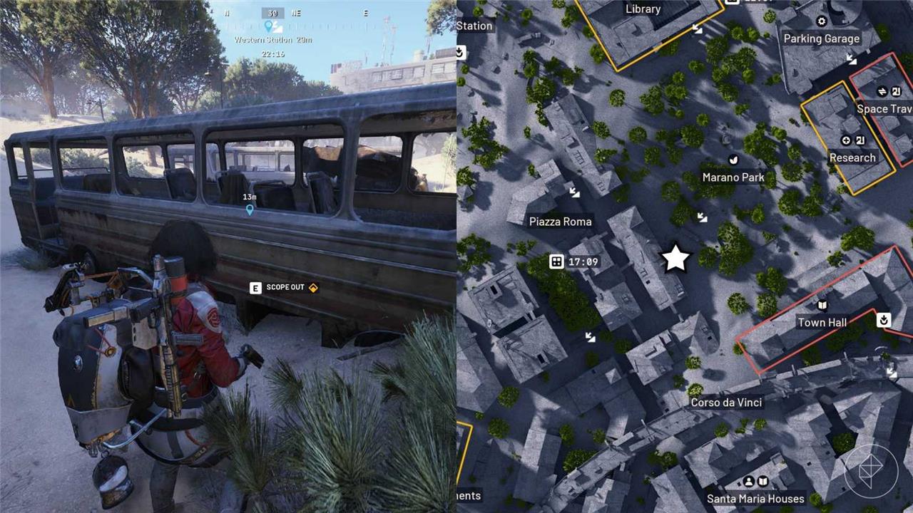 Firstly, the Parking Garage staircases. Head to either the roof or the second floor of the Parking Garage and you’ll find the entrance to the staircase. At the very top of the stairs, you’ll find a prompt to scope out. Interact with it and bam, objective complete.