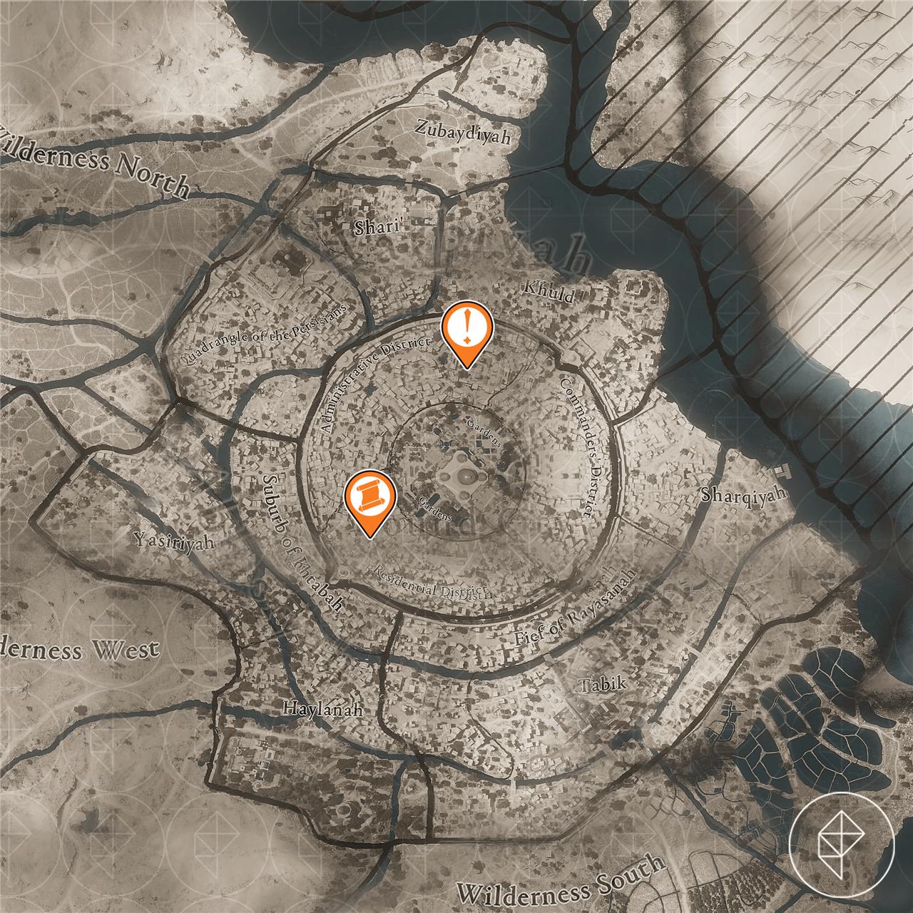 To solve the Enigma, decipher the riddle’s clue, which leads you to the Mazalim Courts in the Administrative District of the Round City. Enter the Courts from the western gate, and you’ll find a dry fountain directly ahead. The treasure is hidden in a dirt pile within the fountain’s basin on the west side of the Mazalim Courts. Claiming it rewards you with the Bedouin Talisman, a cosmetic item for Basim.