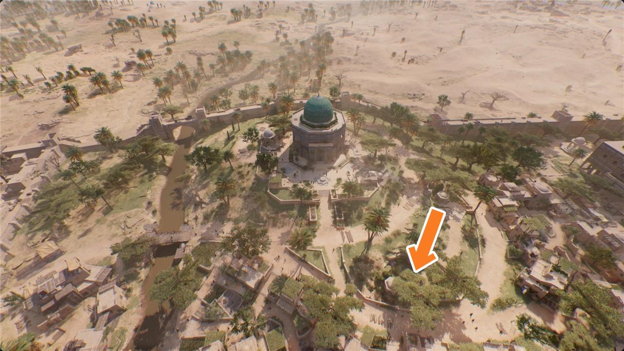 The “Delight by the Dome” Enigma in Assassin’s Creed Mirage is located at the Mosque viewpoint in the Suburb of Kahtabah, Abbasiyah. To find the Enigma scroll, head to the small shelves under the left archway near the mosque. The puzzle’s solution points to the Dome of the Ass, situated in the southern part of Abbasiyah. The treasure is hidden in a small pond northwest of the dome, where you will find the reward-a Mysterious Talisman-on a pile of dirt submerged in the water. This enigma requires players to explore the area carefully and use the clues from the scroll to locate the exact pond near the dome’s gardens.