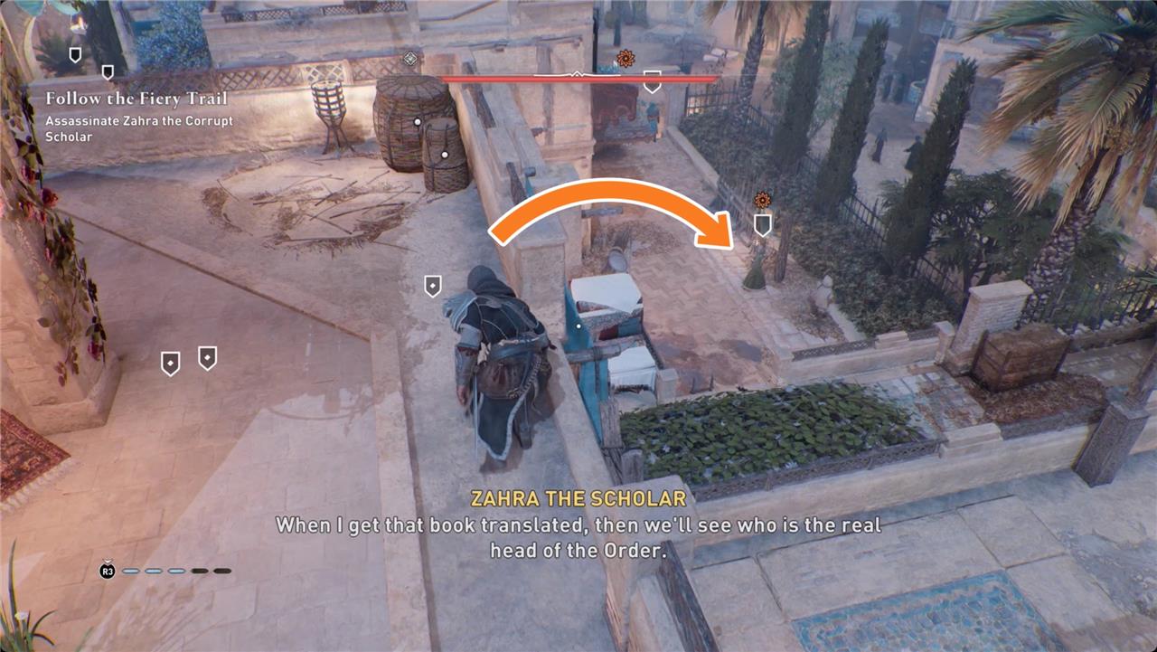 After gathering proof of Zahra’s involvement with the Order at the Scholar’s Estate, your next objective is to assassinate Zahra the Corrupt Scholar. Head to the rooftop overlooking the estate and wait for Zahra to return home, where she will issue orders to her servants before sitting on a bench in the courtyard. For a clean and stealthy kill, wait until Zahra leaves the bench and walks beneath your vantage point, then perform an air assassination to eliminate her swiftly. After the assassination, quickly exit the estate to complete this stage of the “Follow the Fiery Trail” quest.