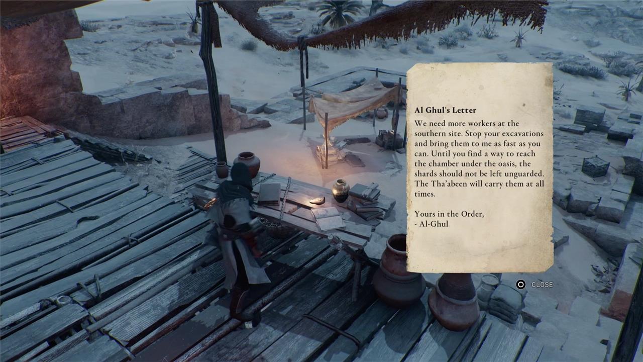 Once you reach the oasis, scale the platforms on the southern edge of the worksite. You’ll find a note from Al-Ghul – who, if you’re this far in the narrative, you’ve likely already taken out – describing a “chamber under the oasis.”