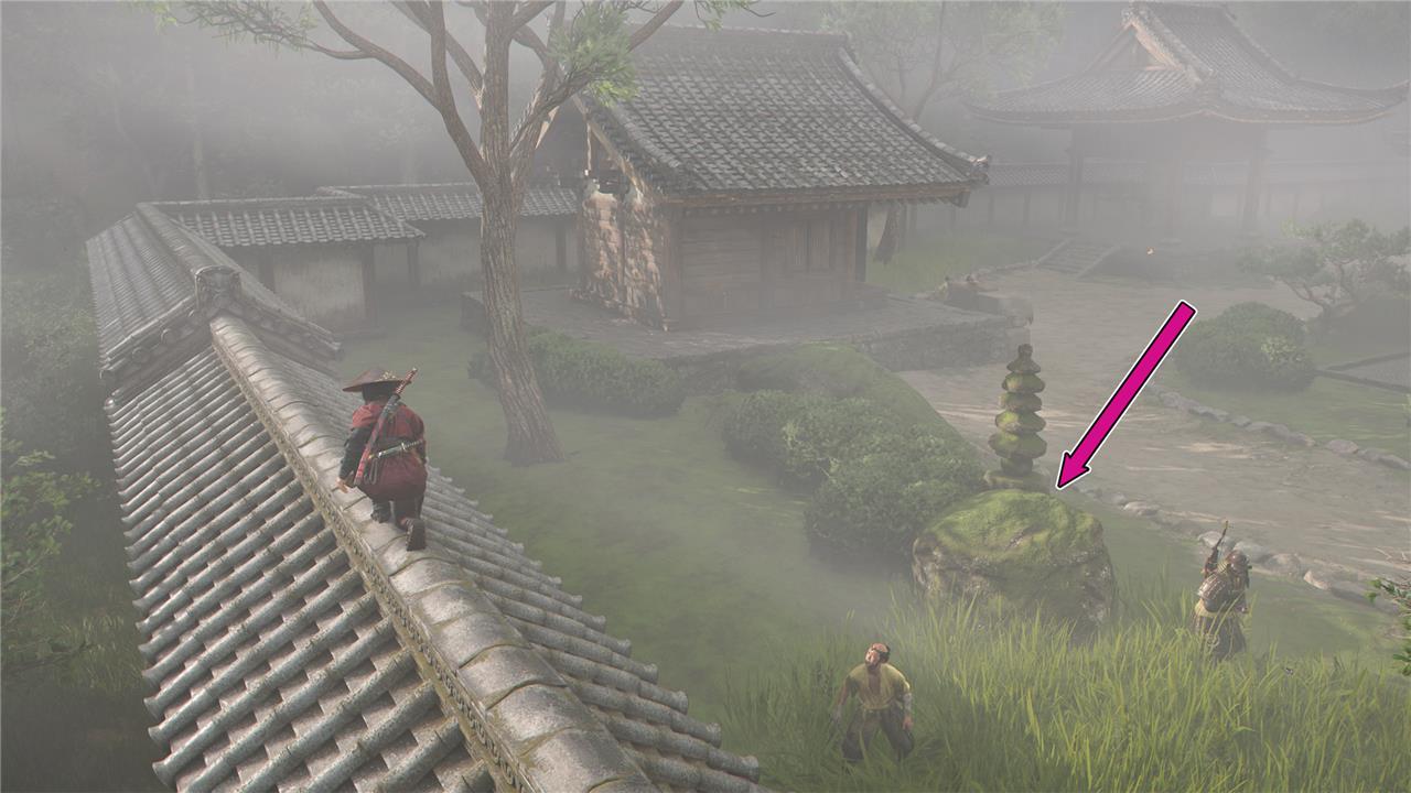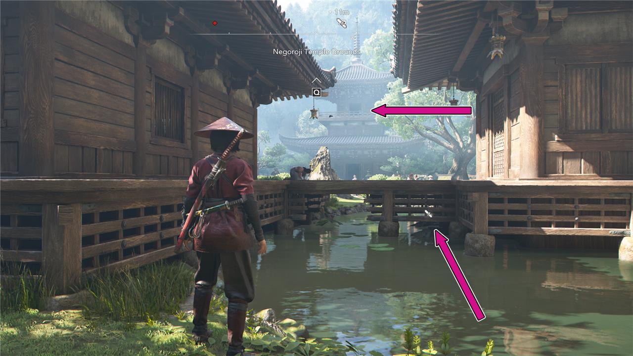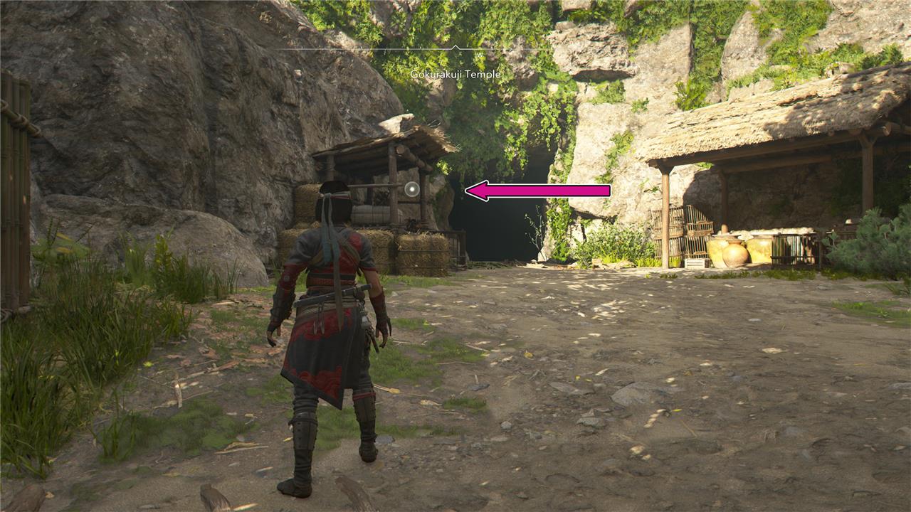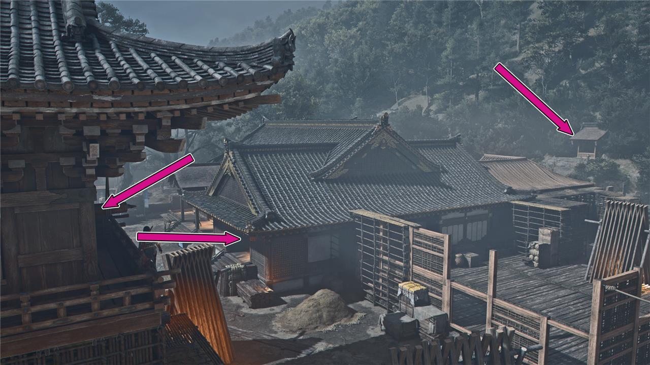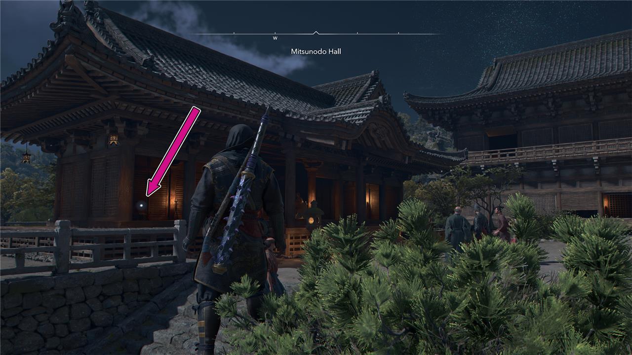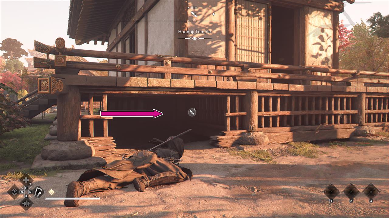 • The first is below the floor of the building next to the large pagoda, on the pagoda’s southwest side. You can crawl underneath the flooring from the outside after you destroy some pots blocking the entrance (northwest corner of the building).