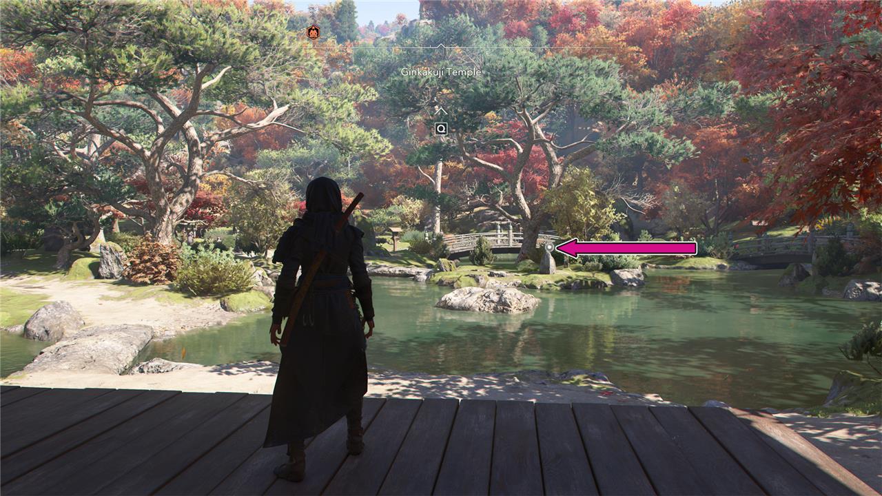 The Ginkakuji Temple is situated near a lake, northeast of Kyoto. To find the two Lost Pages, stand with your back to the largest building and look towards the pond.