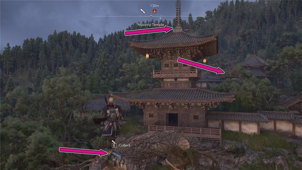 The Nyoirinji Temple is situated between a Shrine and a Kuji-Kiri location. Even better; it has a viewpoint, so you can teleport there directly. This temple has three Lost Pages.