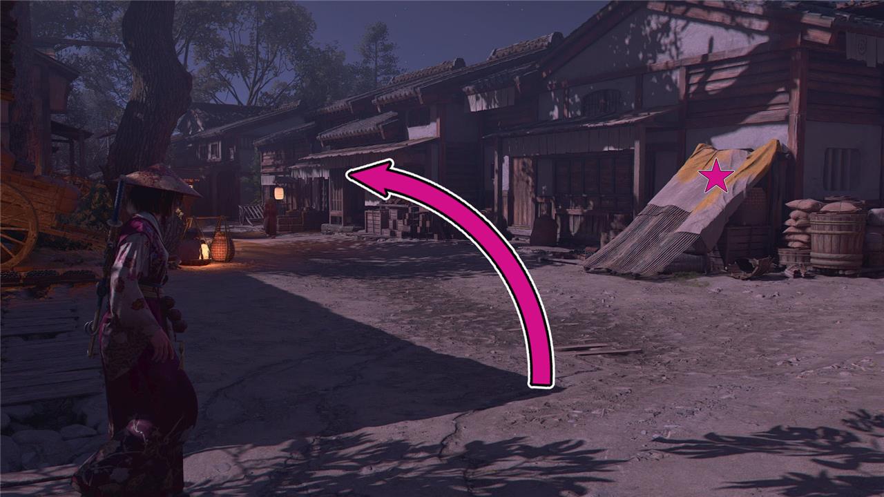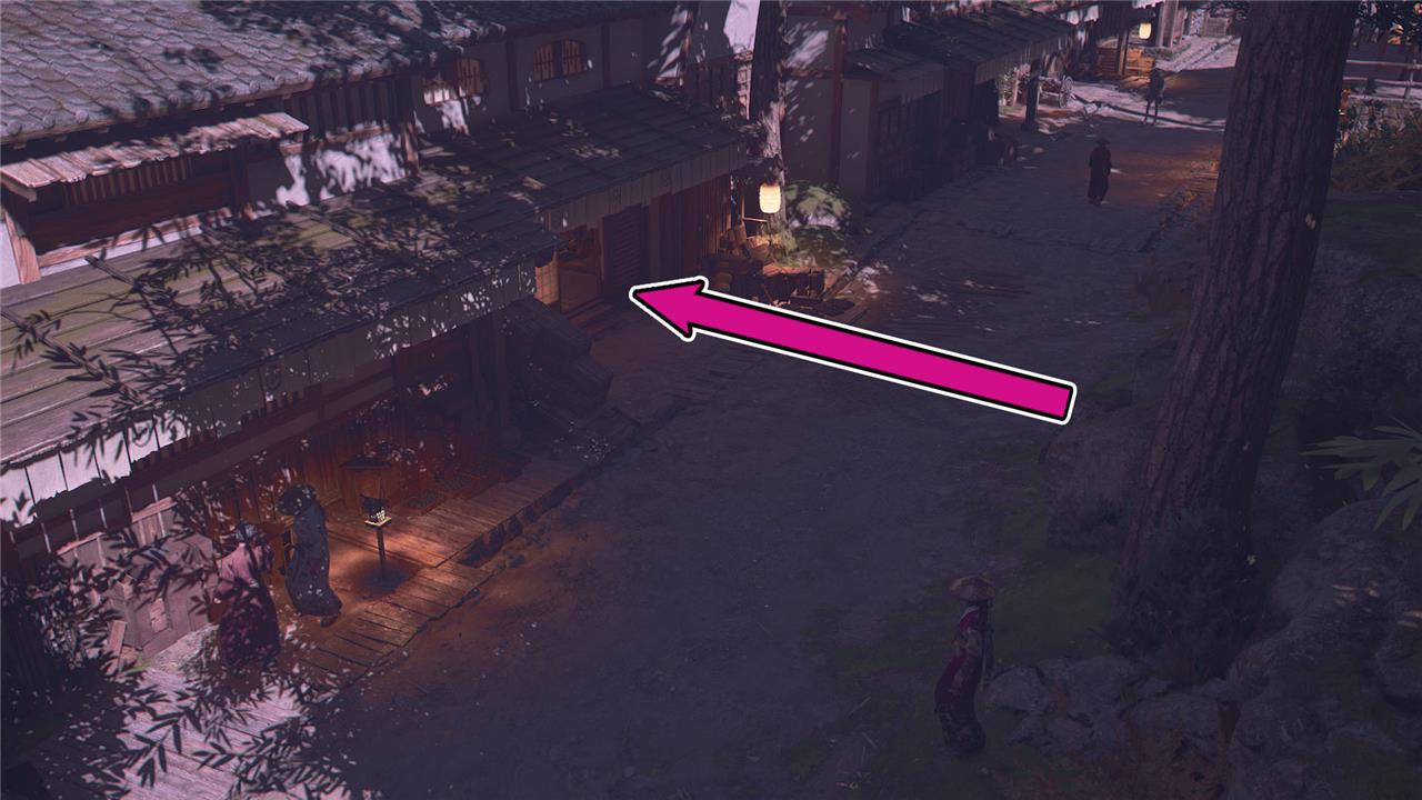When you arrive in Sakai, you spend some time talking to a few gunsmiths looking for any information regarding a woman who has a golden teppo. On the eastern part of town, you’ll find two men talking who you can eavesdrop on their conversation.