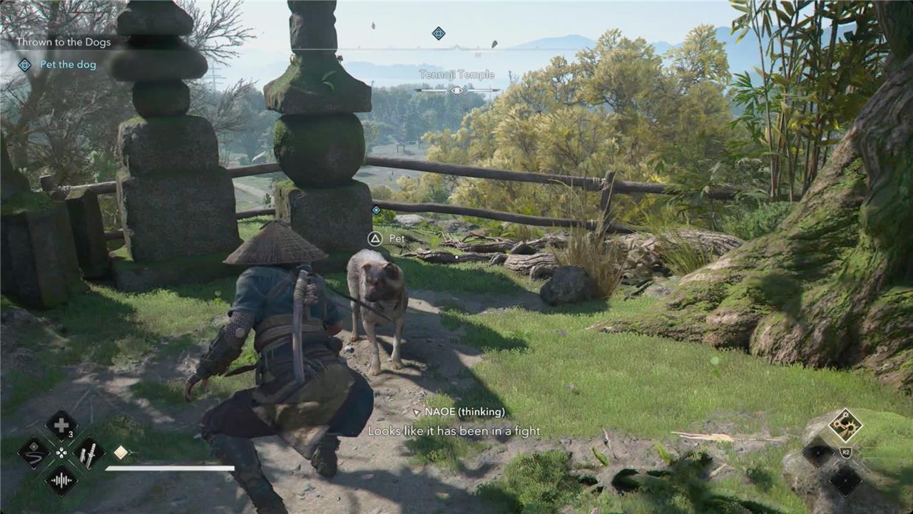 The dog in the “Thrown to the Dogs” quest in Assassin’s Creed Shadows can be found at Tennoji Temple, located on a hill in the northwestern corner of the Izumi Settsu region near Osaka. The area is marked by purple petals on the ground, and the dog is near the burial site of its owner, Ichiro. To start the quest, pet the dog at this location, after which it will lead you to the next objectives. The exact spot is northwest of Tennoji Temple, accessible via a narrow path through the cemetery and up a small hill.