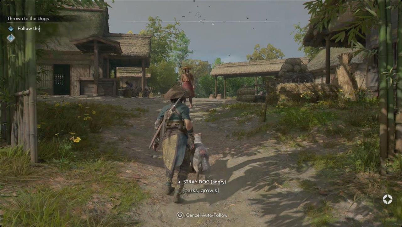 After you pet him, you’ll follow the dog for a ways down the road. Along the way, you’ll have to deal with a few samurai.