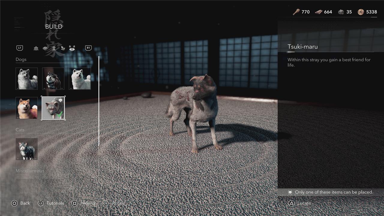 Open the Build menu and tab over to Dogs (and Cats) on the right. From there, you can place Tsuki-maru in your Hideout along with any other dogs and cats you’ve met.