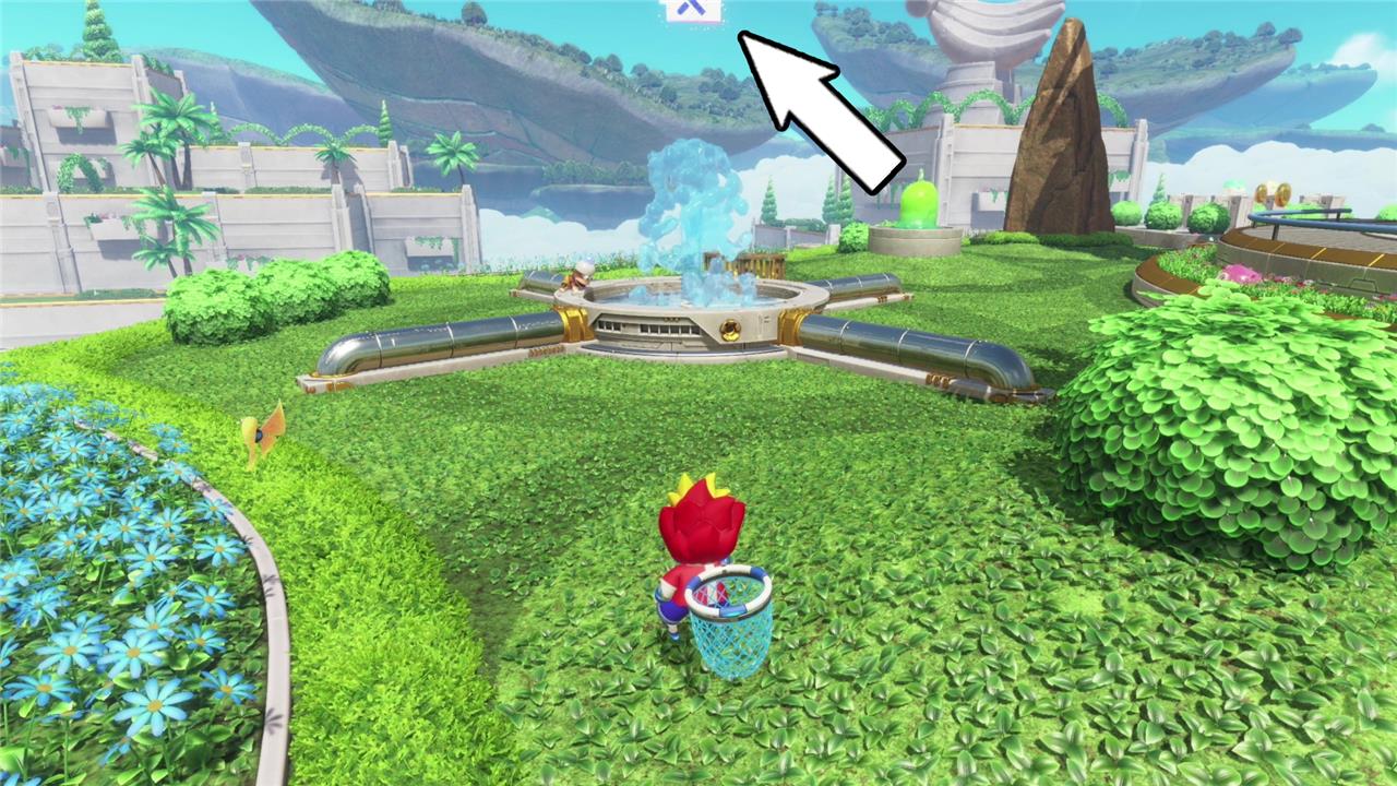 The first puzzle piece can be found hovering above the fountain in the statue area.