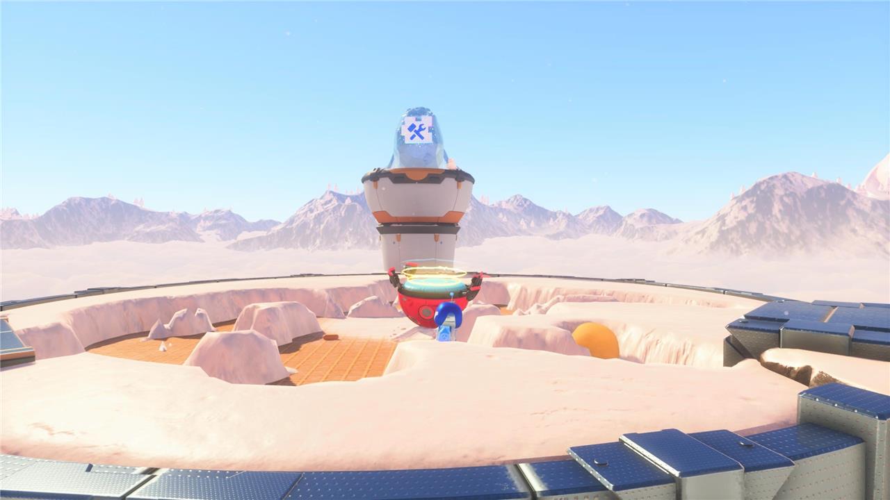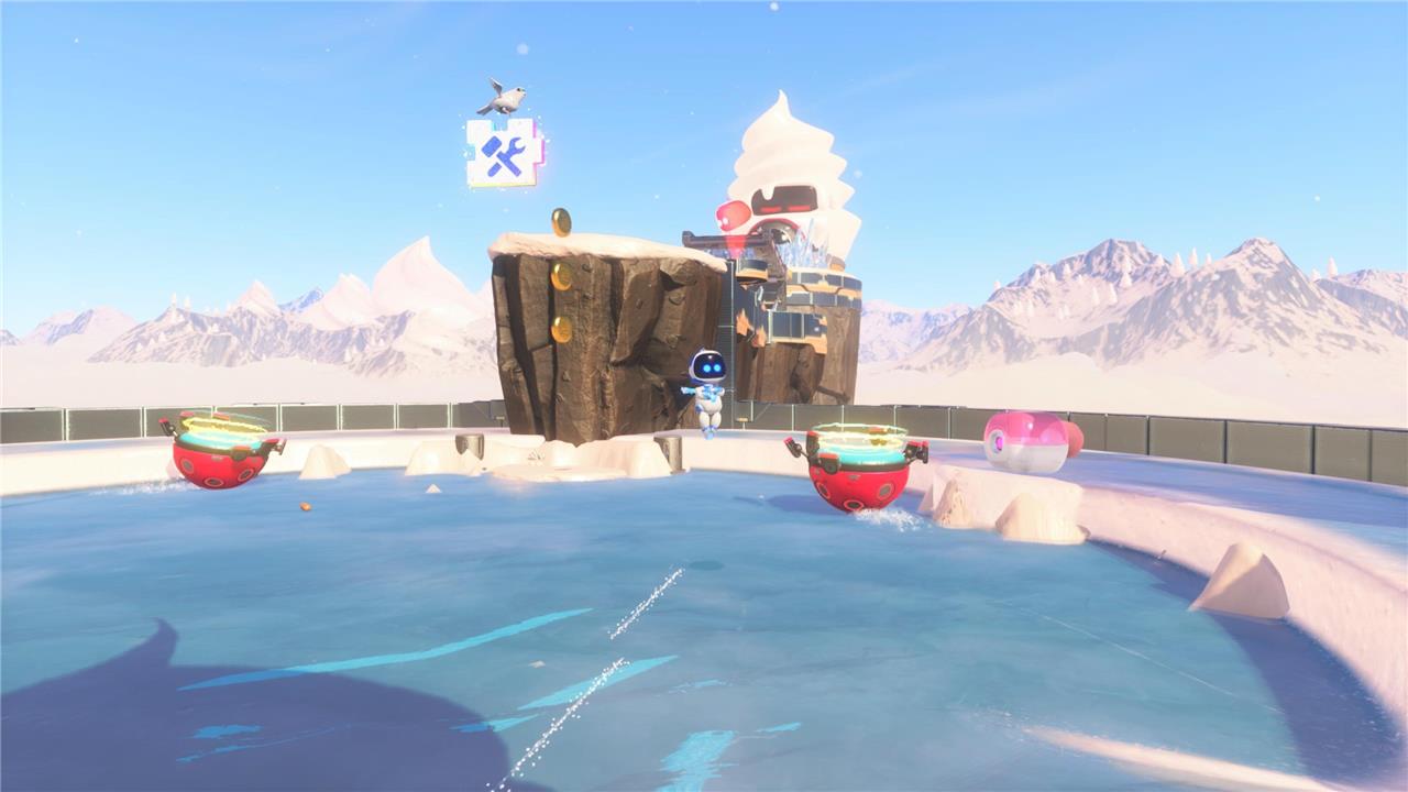 The third puzzle piece in Creamy Canyon is located at the peak. You’ll see a bird holding the puzzle piece flying in circles over an ice rink with two ladybug bots crashing into each other. Use the launch pads on the exposed bellies of the bots to jump onto the ledge on the far side (pictured in the image above). You can hover to the puzzle piece from there.