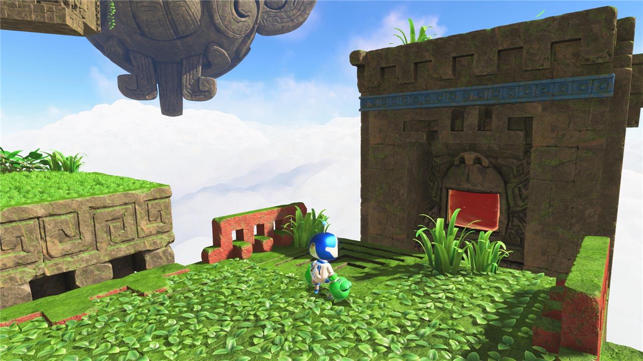 You can find the first puzzle piece in Az-Tech Trail after exiting the temple and using the slingshot to launch yourself across the chasm. On the ensuing platform, before going further, look to your right to see a red block. Pulling the block will reveal a series of platforms leading to the puzzle piece.