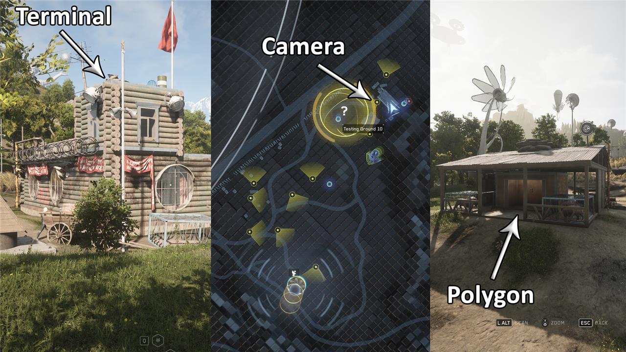 Carefully approach the grey building, as it’s surrounded by enemies. You need to climb to the highest part of the roof to find the terminal. This time, you need to activate three cameras to access the AELGAMES. The one in the south is a bit tricky; you’ll have to look to the right and then down in order to see the interaction button.