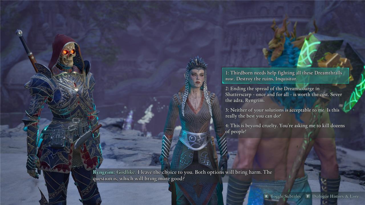 If you side with Ryngrim during the “Shadows of the Past” quest in Avowed, you choose to sever the Adra network in the Shatterscarp region to stop the spread of the Dreamscourge. This drastic measure requires a large amount of essence, which tragically results in the immediate deaths of many inhabitants of the nearby city, Thirdborn. While this choice causes significant short-term loss of life and leaves dead bodies scattered across the region, it ultimately halts the Dreamscourge’s spread, preventing more prolonged and widespread suffering. Mechanically, siding with Ryngrim grants you the Severed Branch Godlike ability, which boosts your movement speed for 20 seconds. From a role-playing perspective, this option is often seen as the lesser evil, as it sacrifices some lives now to save many more in the future, though it does generate resentment among some companions and citizens who blame you for the deaths.