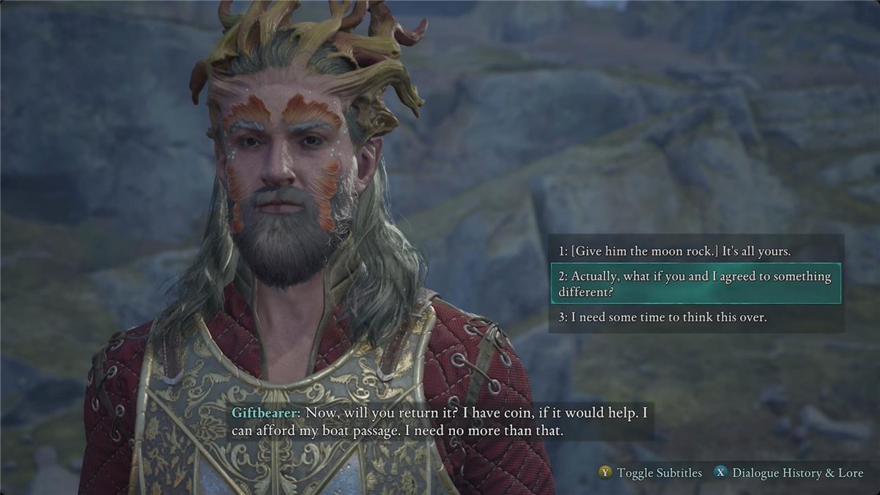 - For the more complicated third option, head to the Giftbearer first. When he asks for the rock, choose the something different dialogue option. He’ll take a memory from you (it doesn’t matter which) and be satisfied. You can then take the meteorite to Josep for his rewards.