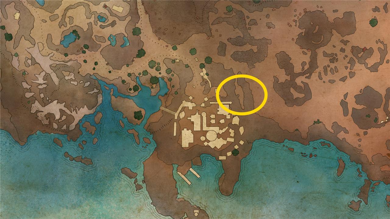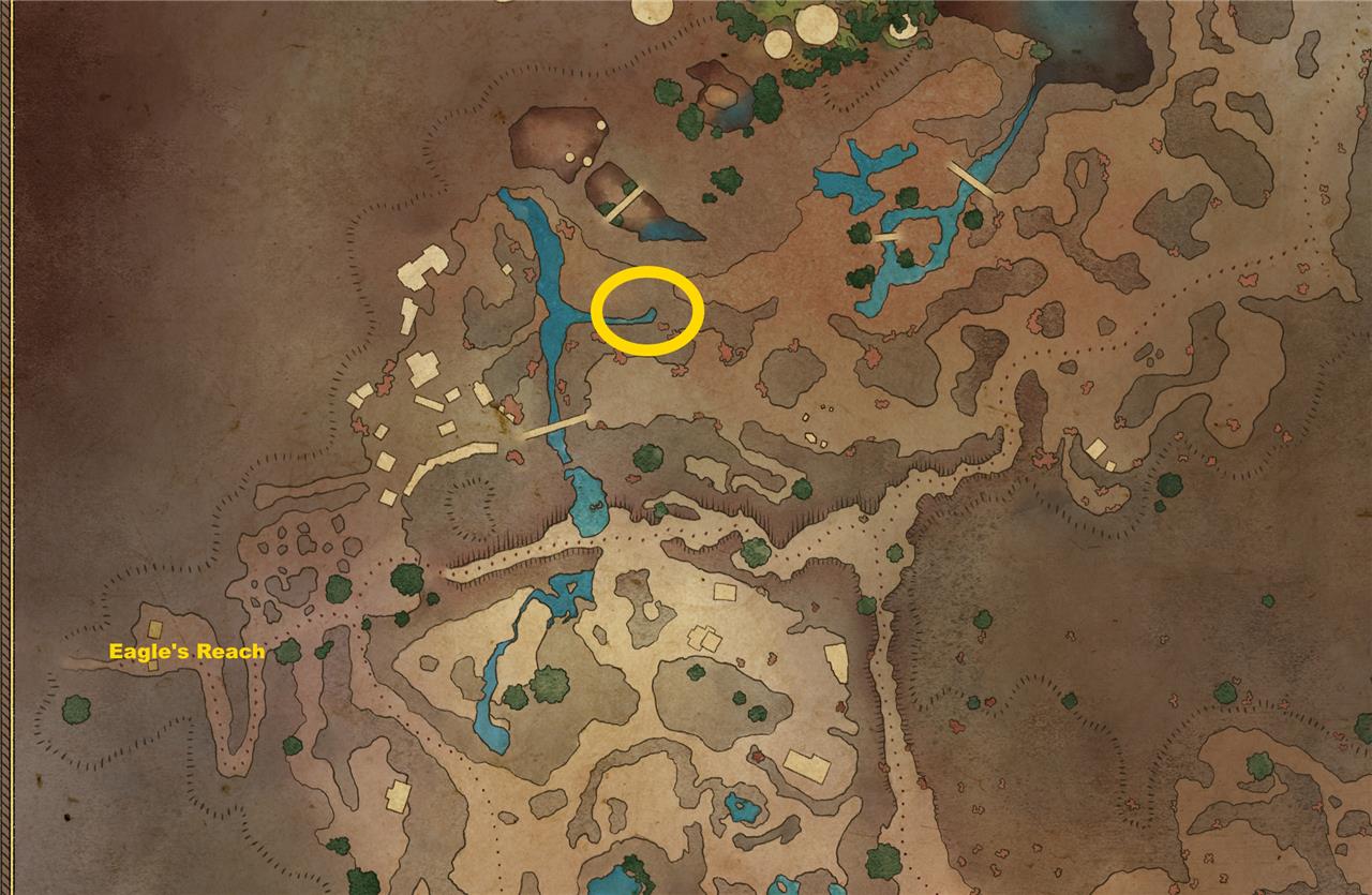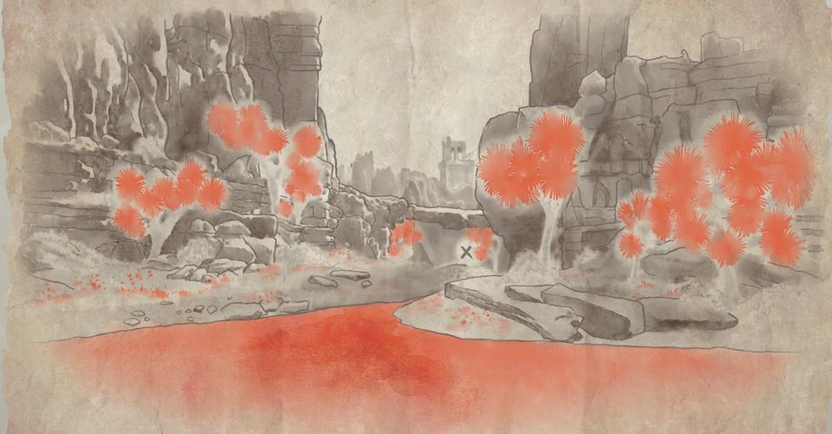 This map shows you a river of red and a stone arch, with a broken stone tower looming in the distance. That tower is Tago’s Tower, east of the Deadfall Highlands, so the map location has to be even with the tower. The only possible area that fits the bill – river, red water, tower to the east – is a spot north of the Sulfur Miner’s Basecamp.