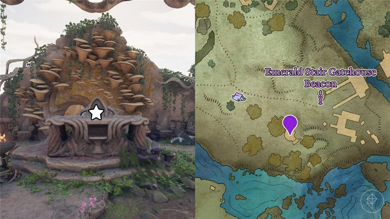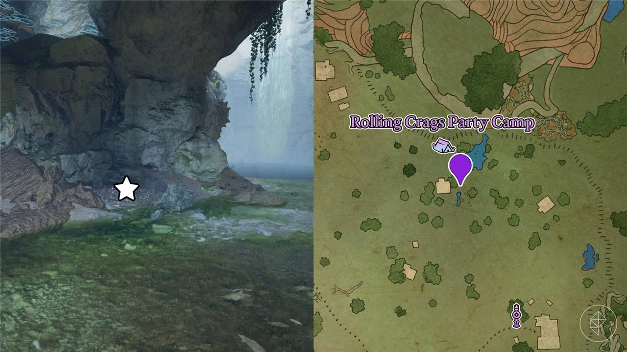 The Emerald Stair starmetal fragment can be found in a cave just south of the Rolling Crags Party Camp. Head to the southern point of the smaller water source on the map to find the entrance of a cave. Head inside to find the starmetal fragment on the floor.