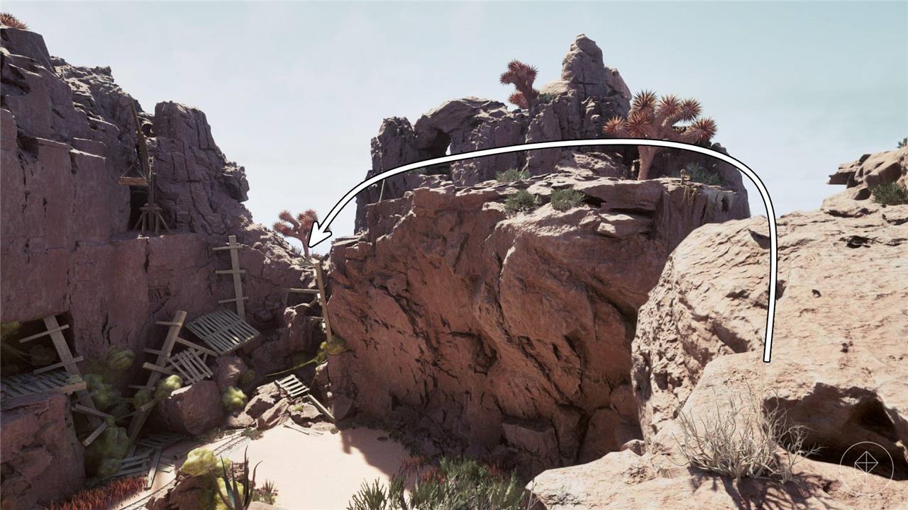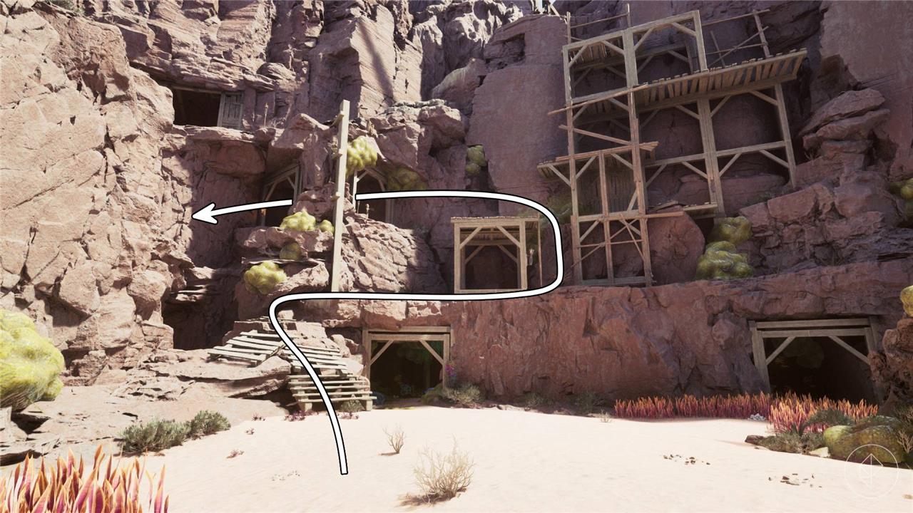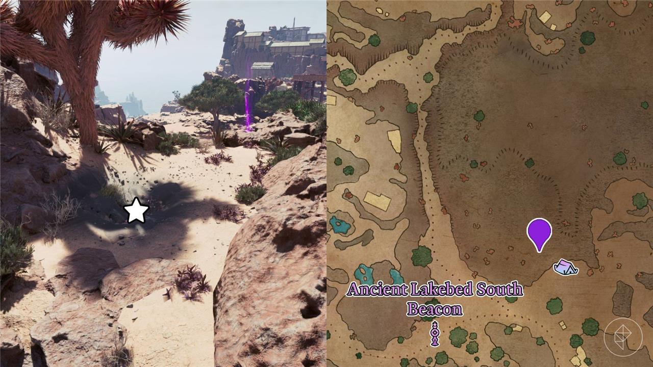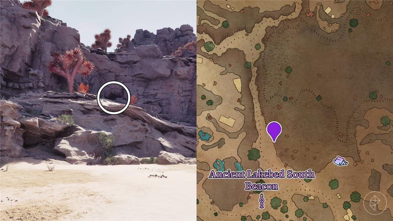 First, travel to the Ancient Lakebed South Beacon and follow the path to the north, but focus your attention to the wall on your right to spot an opening to the Abandoned Mine. Climb up the terrain along the wall and head inside to enter the Abandoned Mine.