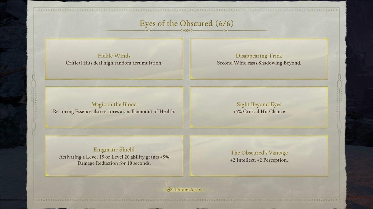 Once you have all of the Totem of Revelations pieces, head to the Totem Shrine at your party camp and reassemble the Eyes of the Obscured. Activate the totem to receive the following buffs:
