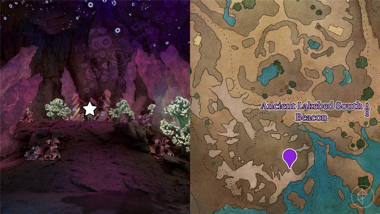 The Amethyst Eye, the third piece of the Totem of Revelations, is located southeast of the Ancient Lakebed in Shatterscarp. To find it, head toward the flame-scarred village of Scaedclef and look for a natural rock archway just south of the locked house in the area. The Amethyst Eye fragment rests on the ground beneath this archway, making it easy to spot once you reach the correct location. This spot is also near the Mourning Thirdborn NPC, providing a helpful landmark for your search.