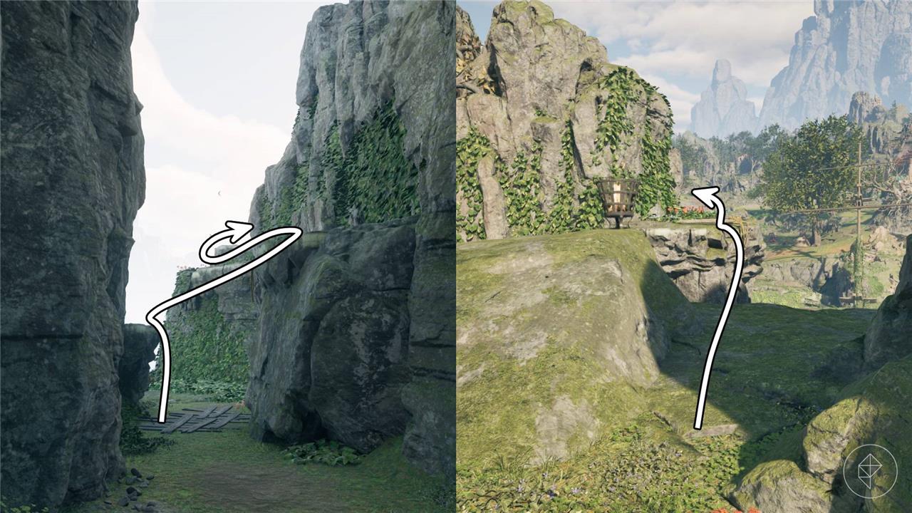 - Climb to the top of the terrain and walk along the wall on your right until you reach the edge.