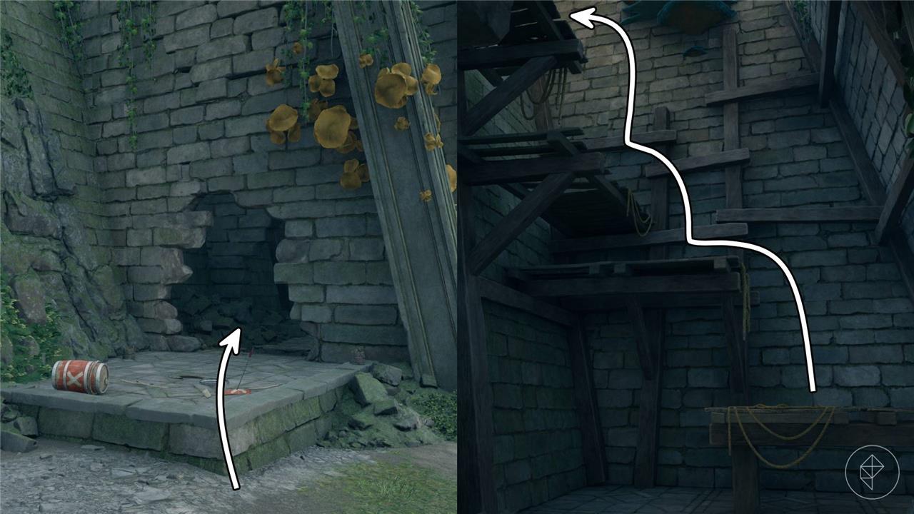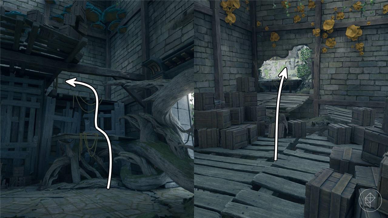 - Follow the pathway into the building and climb the wooden platforms in the corner of the room.