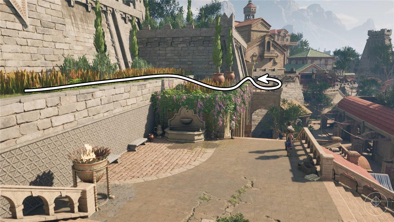 - Go up the stairs and turn to the left to find a path between the building and the wall.