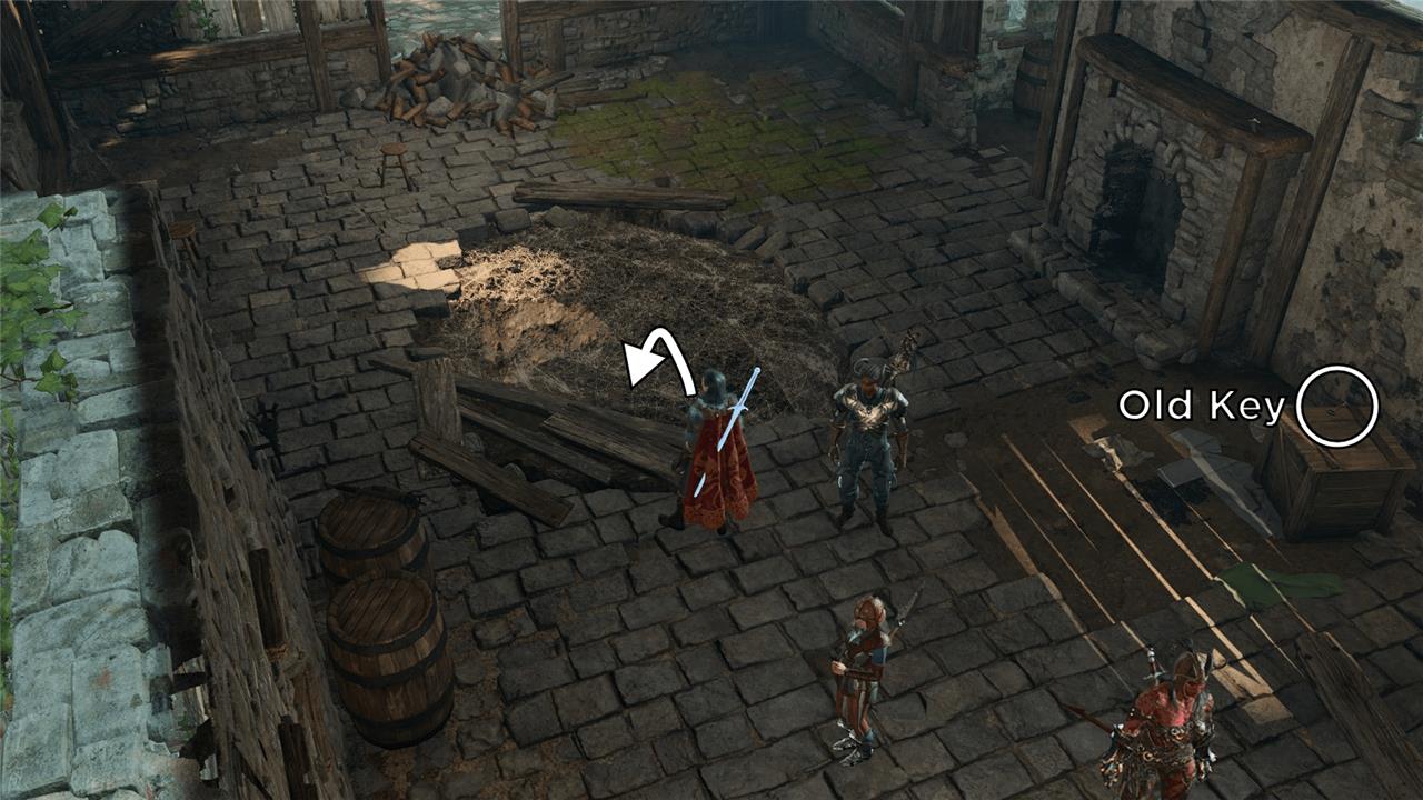 2. Burn the webs with either a fire spell or one of the few torches around the building to open the hole, but before you drop in, make sure to grab the old key on top of the wooden crate beside the fireplace.
