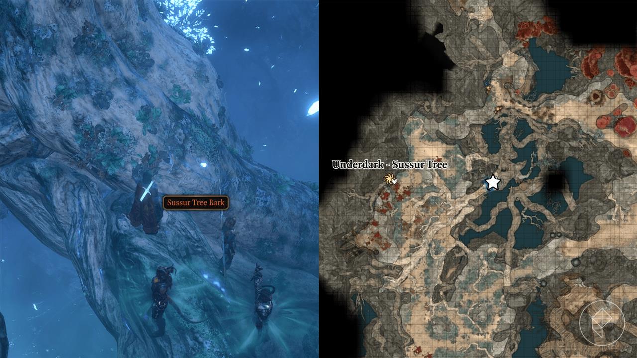 Sussur Tree Bark grows on a large, glowing white Sussur Tree in the Dread Hollow area of the Underdark in Baldur’s Gate 3. Head to the western side of the Underdark map, near the Sussur Tree Waypoint at roughly X:-42 Y:-145.