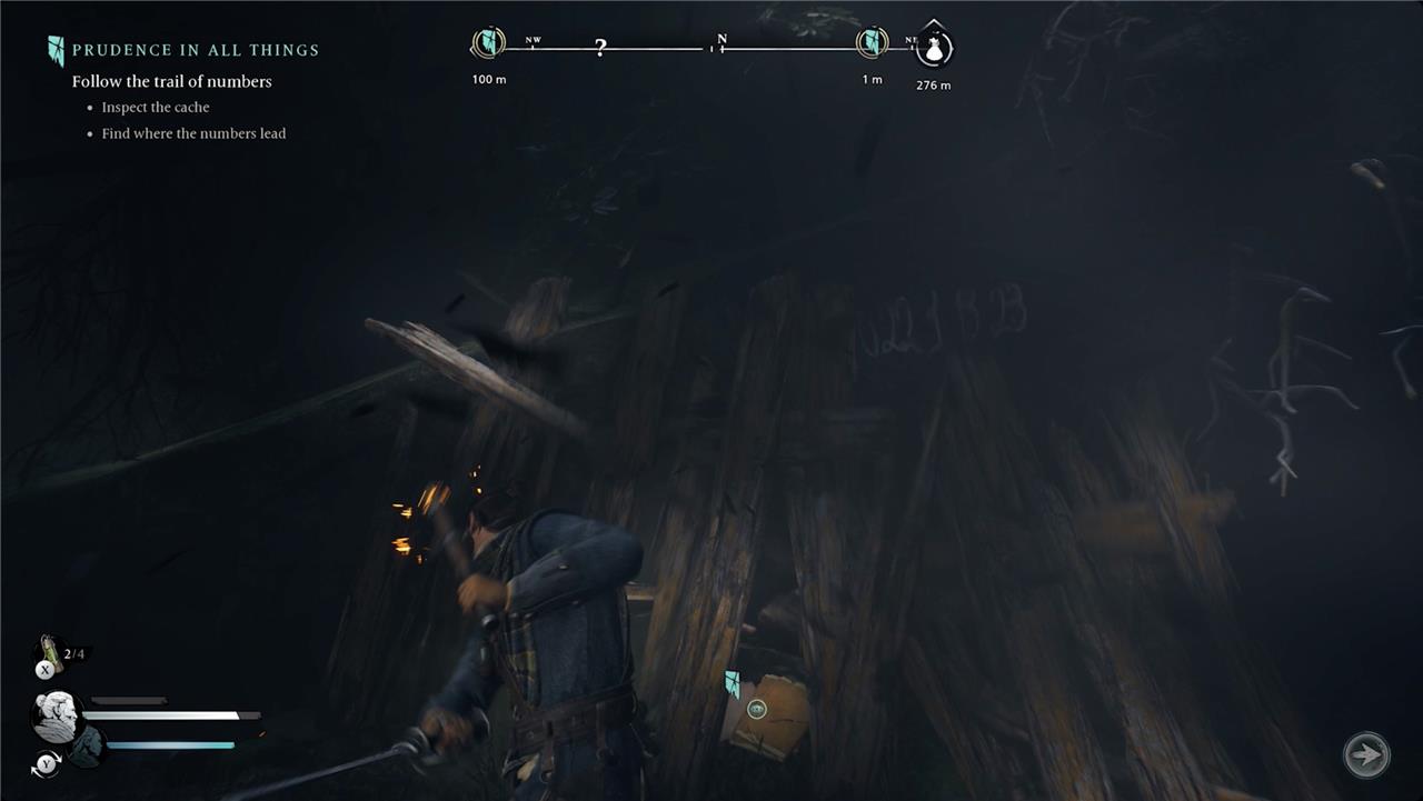 - As you continue west, head to the marker along the south side of the path. You’ll find a cave and a book inside hidden behind a destructible wooden barrier. Smash it and read the book to get Prudence’s third hint and her intent.