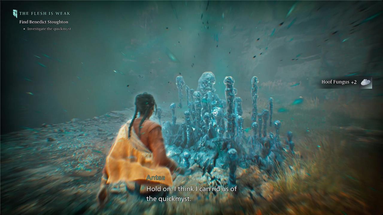 • Head outside and to the northeast to drop down into the quickmyst-filled valley. Switch to Antea to navigate it and head (generally) southwest. When you reach the strange stalagmites and clear the specter nest, you’ll also clear the quickmyst. Perform a Harkening ritual with 3 wild chervil and 1 lilac hyacinth to get Jacob’s second hint.