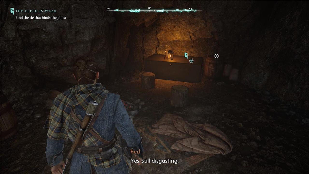 • There’s plenty foreboding in the cave, but the butchered meat on the southeast side will give you your first hint for the ghost.
