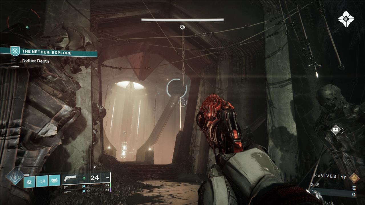 Load into a private version of The Nether over and over again until it serves you up the Court of Oryx area, the Hall of Souls. Inside, head to the middle platform where you normally fight the boss of this area. Run through the hall with the Thrall statues until you’re looking at where you load in for the King’s Fall raid, but don’t cross the bridge. Instead, look up and to your right. If you see a large Blight ball latched onto the strut near the ceiling (like in the image above), you’ve found it. If not, load back in until you find the Hall of Souls and the Blight.