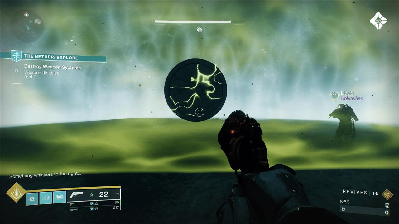 To solve the “something whispers” puzzle in the Barrow-Dyad Exotic quest in Destiny 2, you need to follow a sequence involving a rune circle and directional whispers. First, step on the plate facing the rune circle and shoot the rune circle. Then, step off the plate in the direction indicated by the whisper text that appears in your HUD. Doing this correctly will teleport you through the correct portal. After teleporting, collect the Taken Osseous Fragment in front of you, then return through the portal to the Nether to continue the quest or exit to proceed with the Exotic questline.