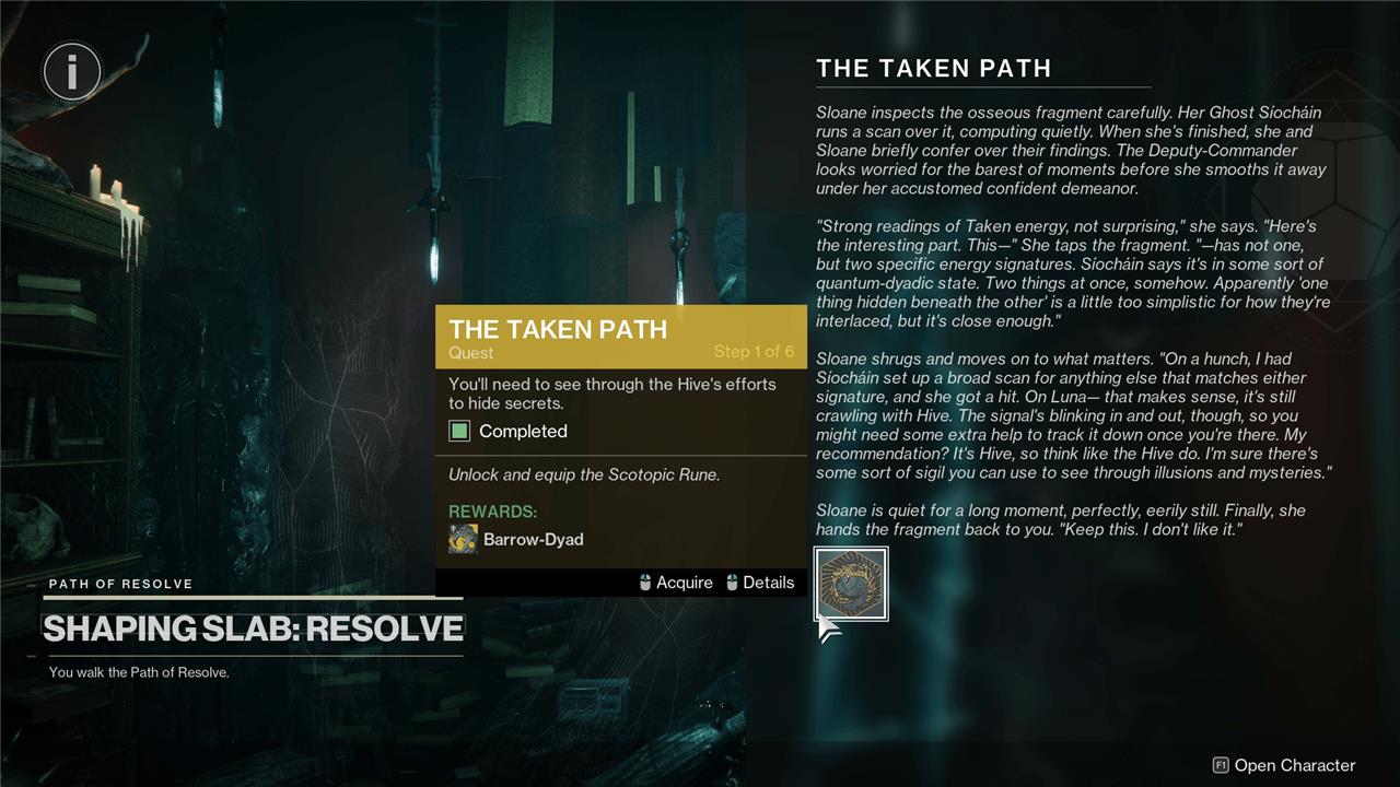 Once on the other side, go to the elevated table sitting inside the Blighted Cyst and interact with it. You’ll pick up the Taken Osseous Fragment, an Exotic “redeemable” item that has no indication on where you should go next. Open your Director and head to the Shaping Slab in Eris’ apartment. Talk to it and you’ll pick up “The Taken Path,” an Exotic quest that promises to eventually reward you with the bizarre Barrow-Dyad Exotic submachine gun.