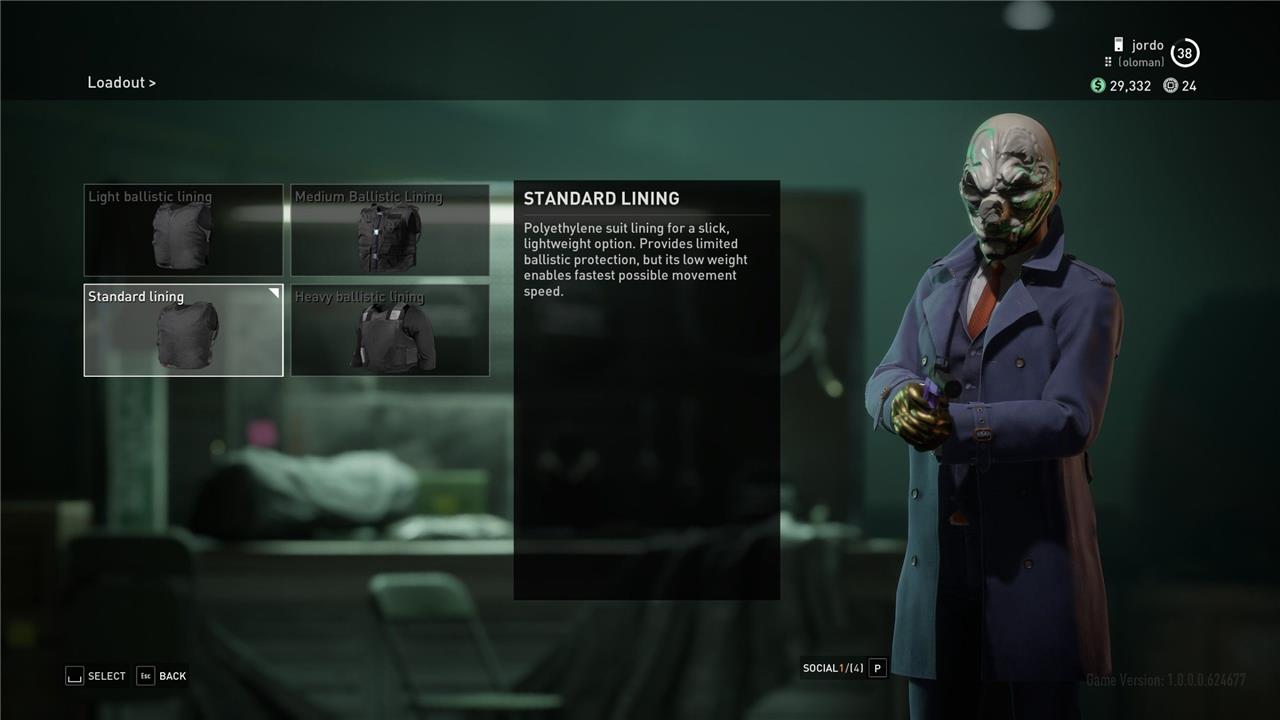 Regarding your armor lining, the Standard lining makes the most sense since it enables the fastest possible movement speed, but if you’re already triggering the Rush movement speed buff with your skills, any armor lining is applicable for stealth. It’s worth considering the Heavy ballistic lining if you’re worried about a heist going loud, as this will offer the most protection, and the movement speed difference really isn’t that notable.