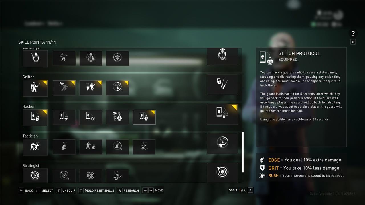 The Hacker tree rounds out the stealth build with important skills for defying security measures. The base Hacker skill allows you to hack cameras, which has obvious benefits for identifying guards, heist equipment and other hazards. Further in the tree, we have Secure Loop, which makes a camera loop its footage so you can surpass it. The most useful skill in the tree is easily Glitch Protocol, though; this allows you to hack a guard’s radio and distract them for five seconds, a window of time you can capitalise on to steal keycards, get into VIP areas, or de-escalate a possible escort or detainment.