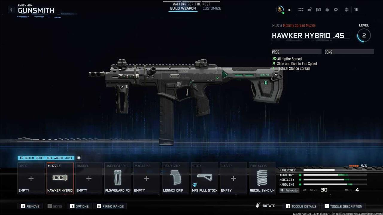 Combine 2-3 of these (e.g., Hawker Hybrid .45 Laser + MFS Full Stock+ + Mobility Foregrip) using Gunfighter wildcard to drop hipfire spread below 10ยฐ even mid-slide. Avoid barrels or heavy stocks that widen spread; test in firing range for feel.โ