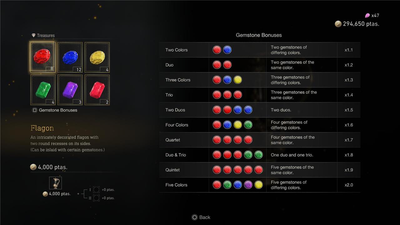 Collect gemstones like diamonds and rubies from enemies, statues, and breakable objects throughout the village, castle, and island areas. Insert them into treasures with matching slots-such as Elegant Crowns or Chalices-via the inlay option in your key items menu to trigger bonuses like Quartet for four matching colors or Five Colors for one of each. Sell these upgraded treasures to the Merchant for maximum Pesetas, as combinations like a fully inlaid crown yield up to 100,000 each, far exceeding individual gem values.