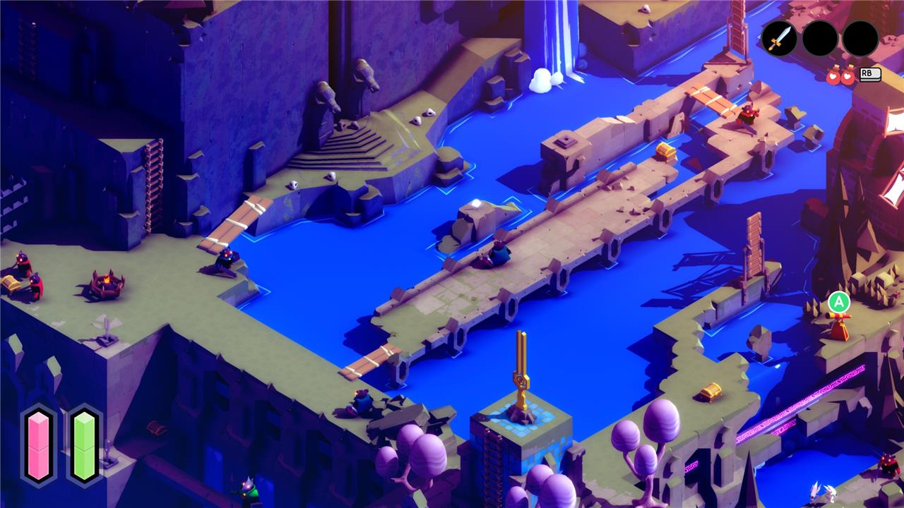 Tunic‘s combat is also quick, responsive, and malleable. What begins as a process of swiping a wooden stick at enemies becomes a deft balancing act of sword strikes, shield blocks, and dodge rolls. The more tools the fox recovers, the more options there are when things get heated.