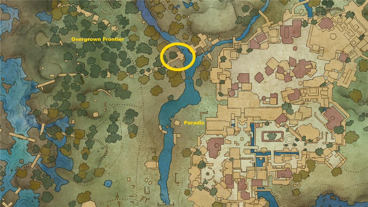 Once you have the map, it directs you to follow the river north until you reach a broken archway near the Western Pargrun Wall fast travel point. On the southern side of the arch, look for large tree roots at the riverbed. Dive underwater near the roots to find a cave entrance. Inside the cave, you will discover a chest and the unique Wind and Wave shield as your reward.