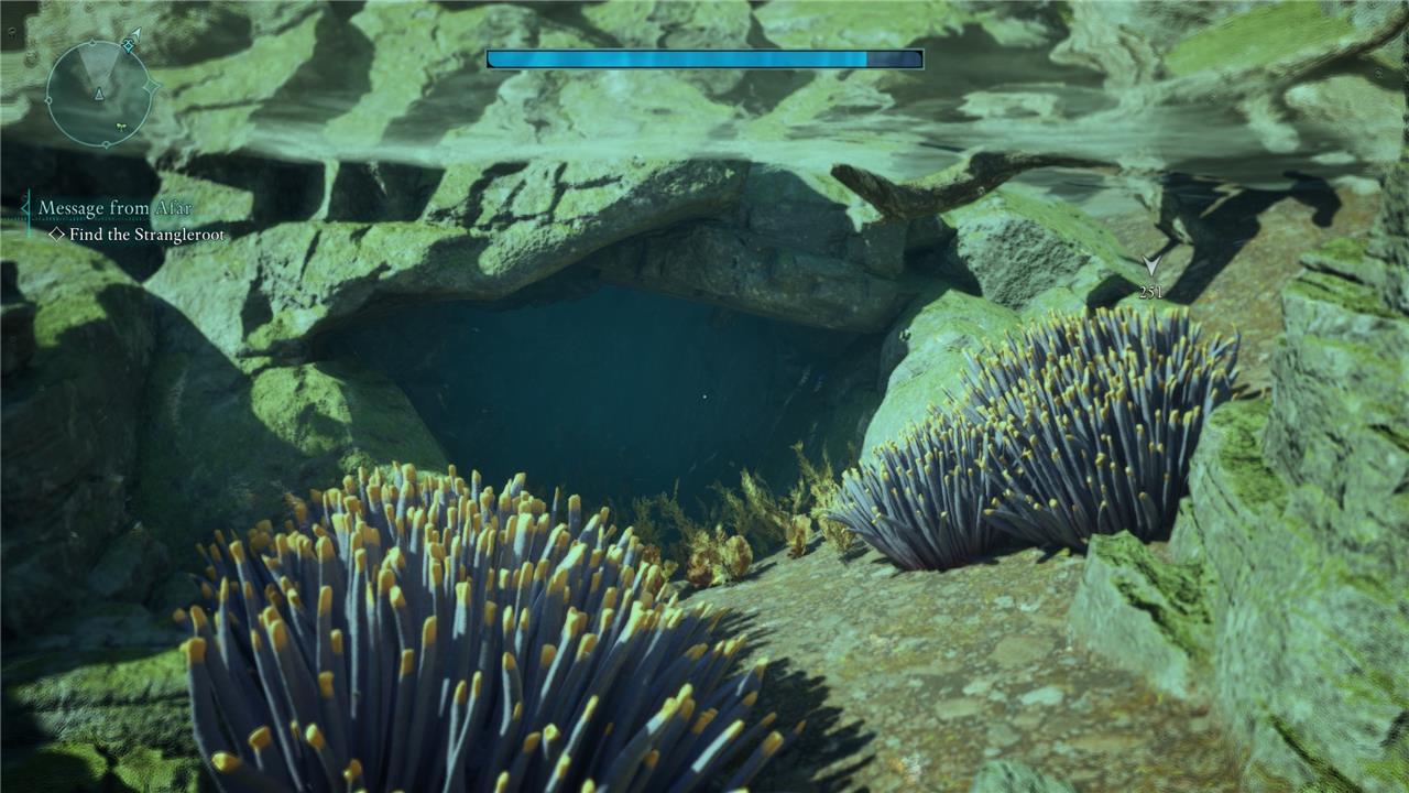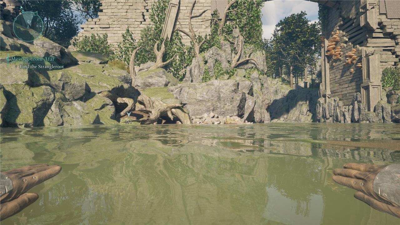 The treasure marker on the map points to a little indent on the bank, though it’s slightly misleading. Look for a cluster of roots, then dive underwater. You’ll see a small passage leading under the bank.