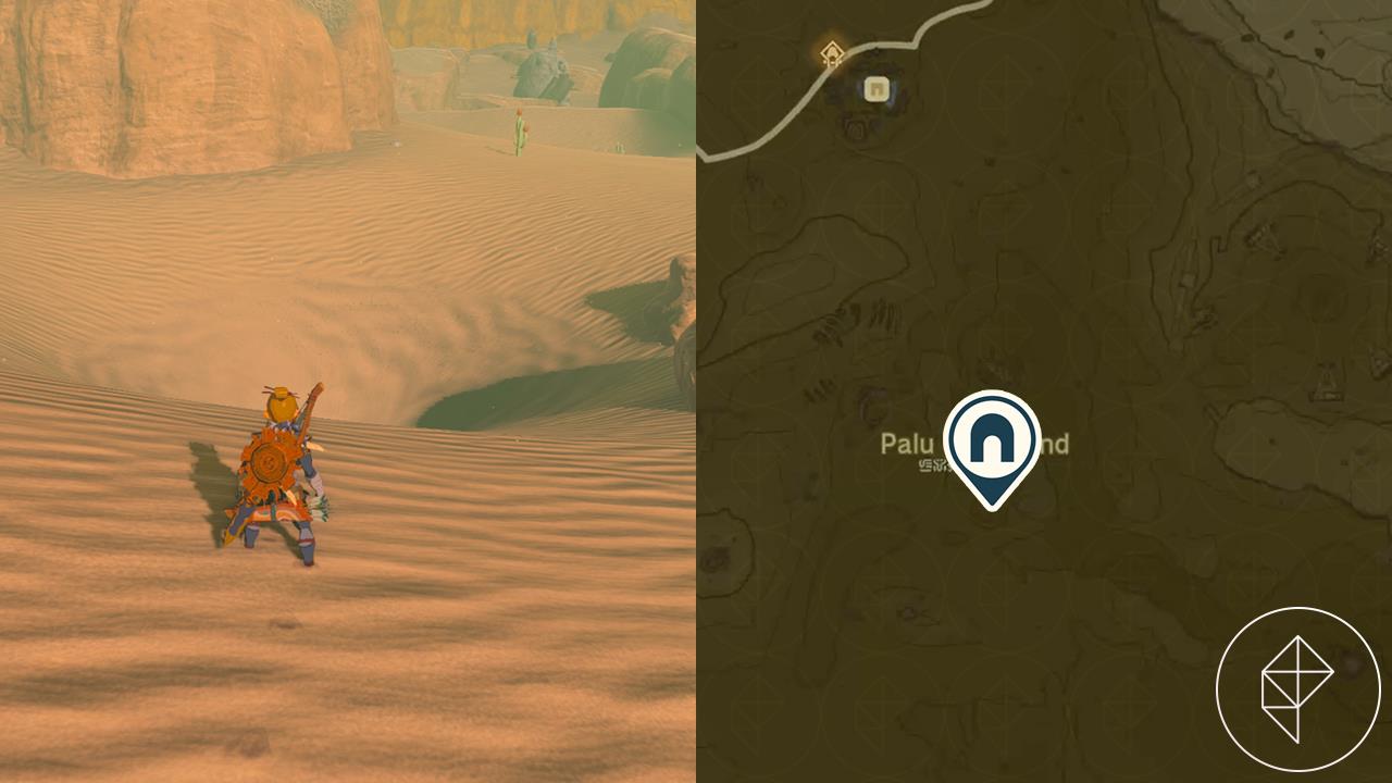 Head south from Kara Kara Bazaar or southwest from Gerudo Canyon Skyview Tower into the Palu Wasteland, east of Gerudo Town. The area features extreme heat, so equip heat-resistant gear like the Desert Voe set or use chill elixirs.